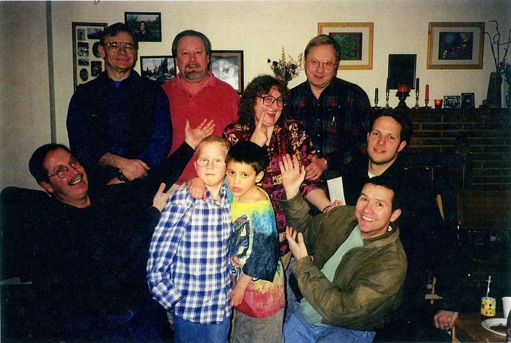 Valyte's birthday January 1999 - surrounded by adoring men!