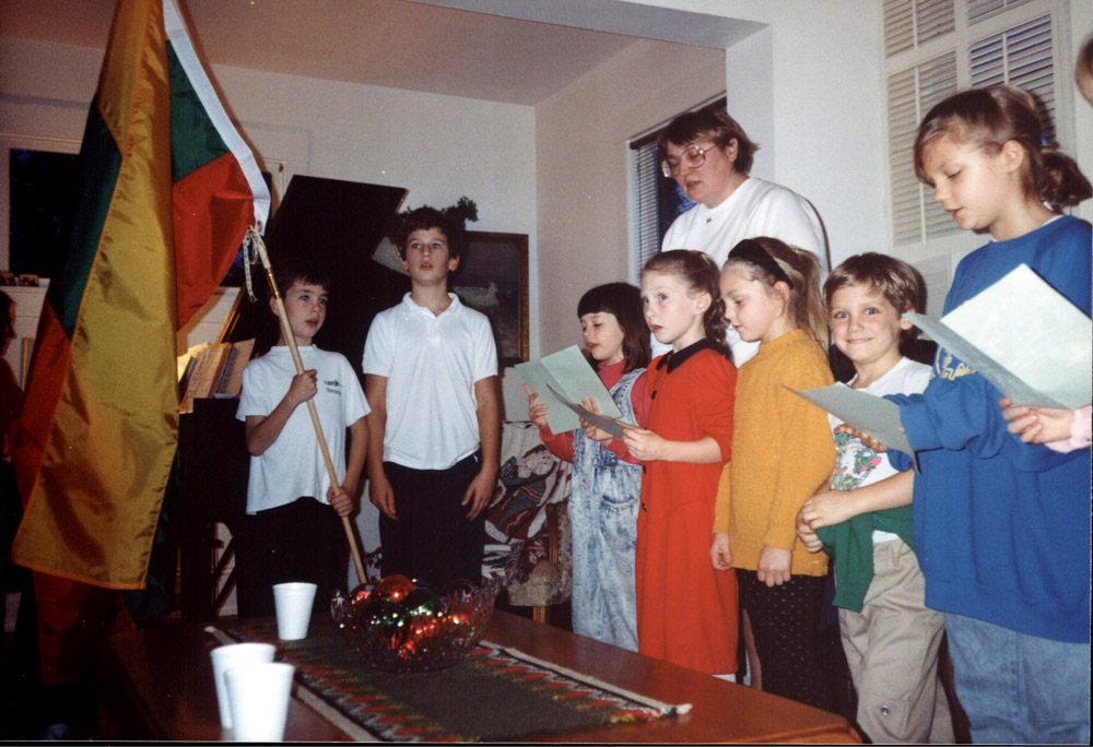 1991 - Valerie starts the Lithuanian Children's Circle in Seattle. Cousin Jerry Prismantas' son David is holding the flag, and daughter Erica is in the blue overalls with red turtleneck.